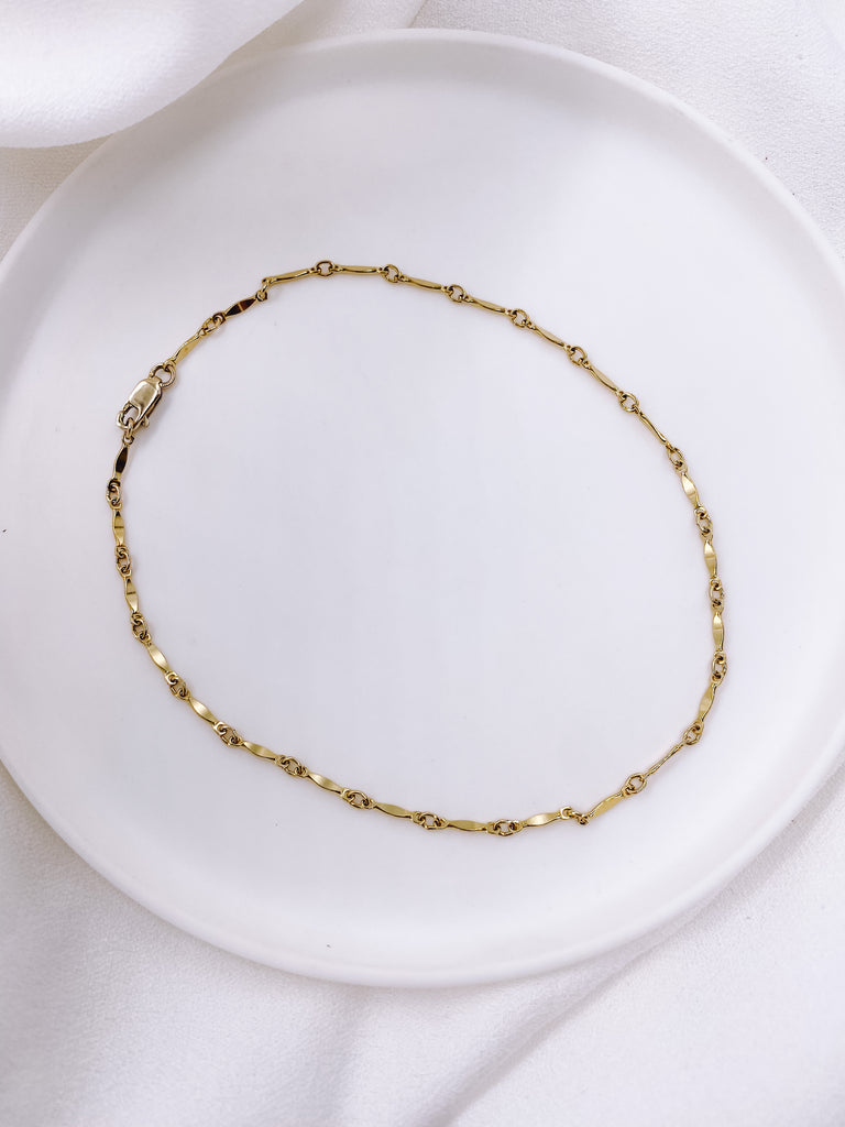 The Iris anklet is flat link chain that that gives off the brightest shine. This anklet is meant to be enjoyed and easily stacked with our other chains, it's pretty and versatile and gives a little something extra to any outfit. The perfect spring summer vibes.